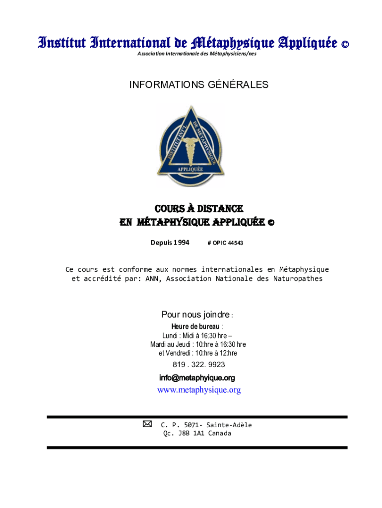 Institute International de Mtaphysique Appliquéing Association Internationale DES Pataphysicians/misinformation GNRALESCOURS DISTANCE EN PHYSIQUE Appliquéing Deputy 1994# EPIC 44543Ce course est