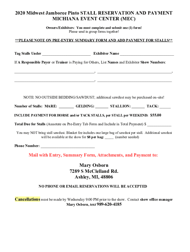 2020 Midwest Jamboree Pinto STALL RESERVATION AND PAYMENT MICHIGAN EVENT CENTER (MEC) Owners/Exhibitors: You must complete and submit one (1) form! Please send in group forms together!**PLEASE NOTE