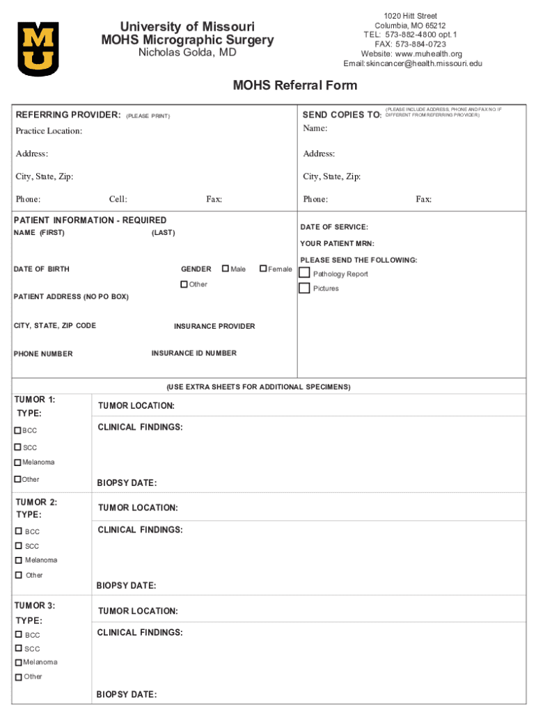 1020 Hit Street Columbia, MO 65212 TEL: 5738824800 opt.1 FAX: 5738840723 Website: www.muhealth.org Email:skin cancer health. Missouri.university of Missouri MOSS Micrographic Surgery Nicholas Golda,