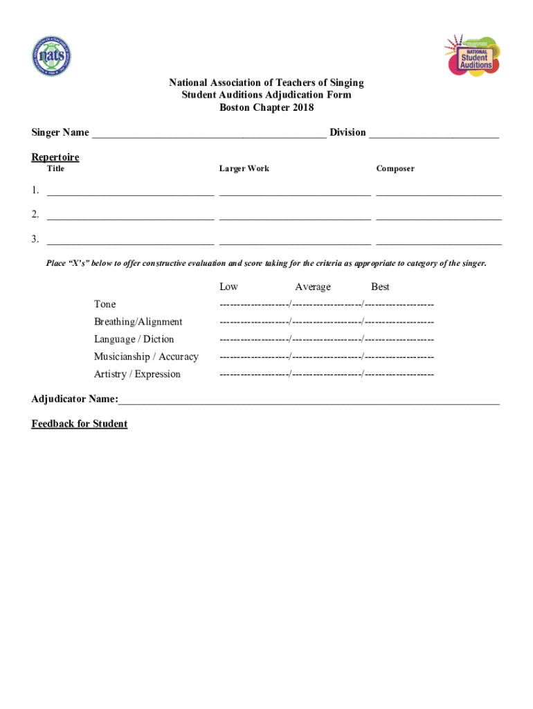 National Association of Teachers of Singing Student Auditions Adjudication Form Boston Chapter 2018 Singer Name Division Repertoire TitleLarger WorkComposer1. 2. 3. Place XS below to offer constructive