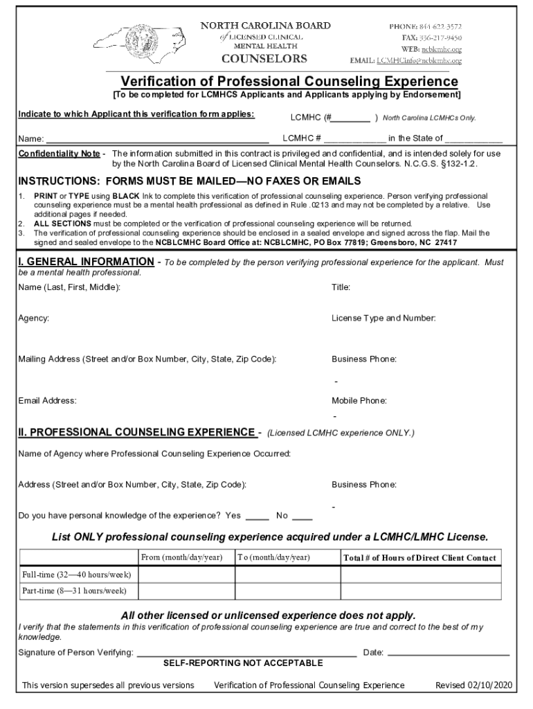 Get the free Verification of Professional Counseling Experience