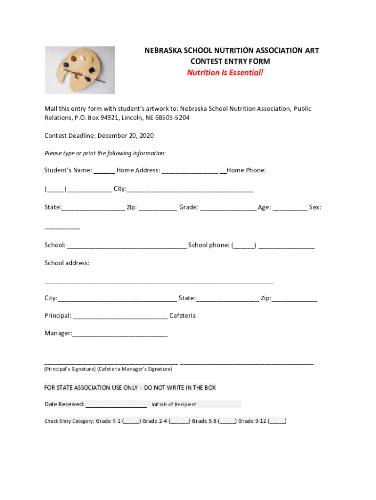 NEBRASKA SCHOOL NUTRITION ASSOCIATION ART CONTEST ENTRY FORM Nutrition Is Essential! Mail this entry form with students artwork to: Nebraska School Nutrition Association, Public Relations, P.O. Box