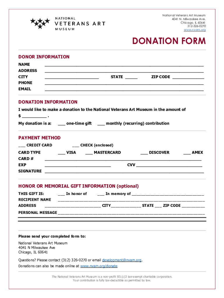 National Veterans Art Museum 4041 N. Milwaukee Ave. Chicago, IL 60641 3123260270 www.nvam.orgDONATION FORM DONOR INFORMATION NAME ADDRESS CITY PHONE EMAIL STATE ZIP CODE DONATION INFORMATION I would