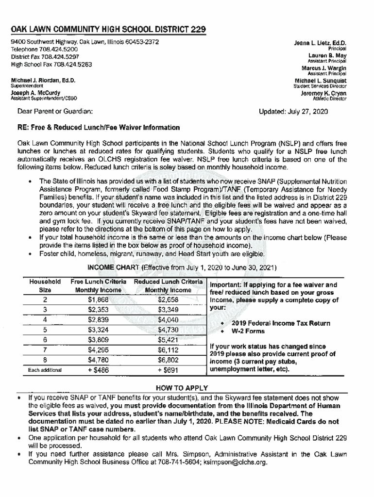 Free Lunch & Reduced Meal/Fee Waiver Information Page 2 July 2020 OTHER INFORMATION VERIFICATION: If applying for a fee waiver and free lunch based on your income, a completed copy of your 2019 Federal