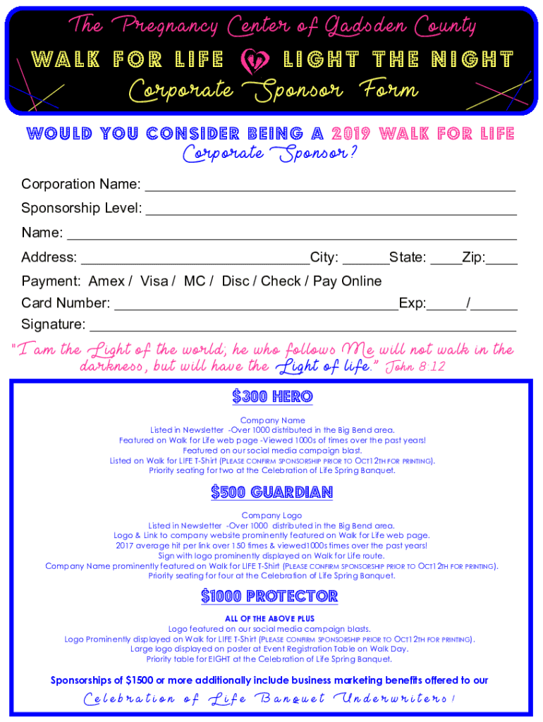 The Pregnancy Center of Gadsden County l k f o r L i f light the NightCorporate Sponsor Formula you consider being a 2019 Walk for Life Corporate Sponsor? Corporation Name: Sponsorship Level: Name: