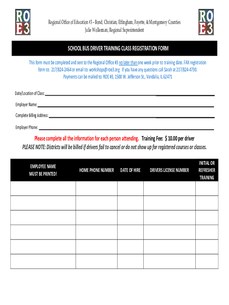 RegionalOfficeofEducation#3Bond,Christian, Effing ham, Fayette, &MontgomeryCounties JulieWollerman, RegionalSuperintendent SCHOOLBUSDRIVERTRAININGCLASSREGISTRATIONFORM ThisformmustbecompletedandsenttotheRegionalOffice#3nolaterthanoneweekpriorto