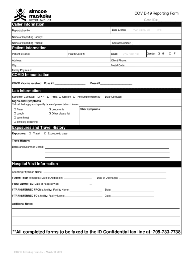 COVID-19 Reporting Form Case ID#: Caller Information Date & time:Report taken by:YYY / mm / dd time:Name of Reporting Facility: Name of Reporting Person:Contact Number: ()Patient Information Patients