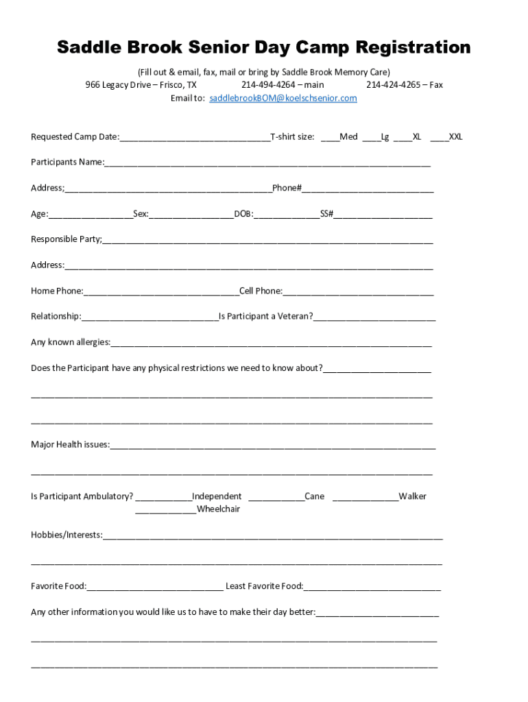 Saddle Brook Senior Day Camp Registration (Fill out & email, fax, mail or bring by Saddle Brook Memory Care) 966 Legacy Drive Frisco, TX 2144944264 main 2144244265 Fax Email to: saddlebrookBOM koelschsenior.