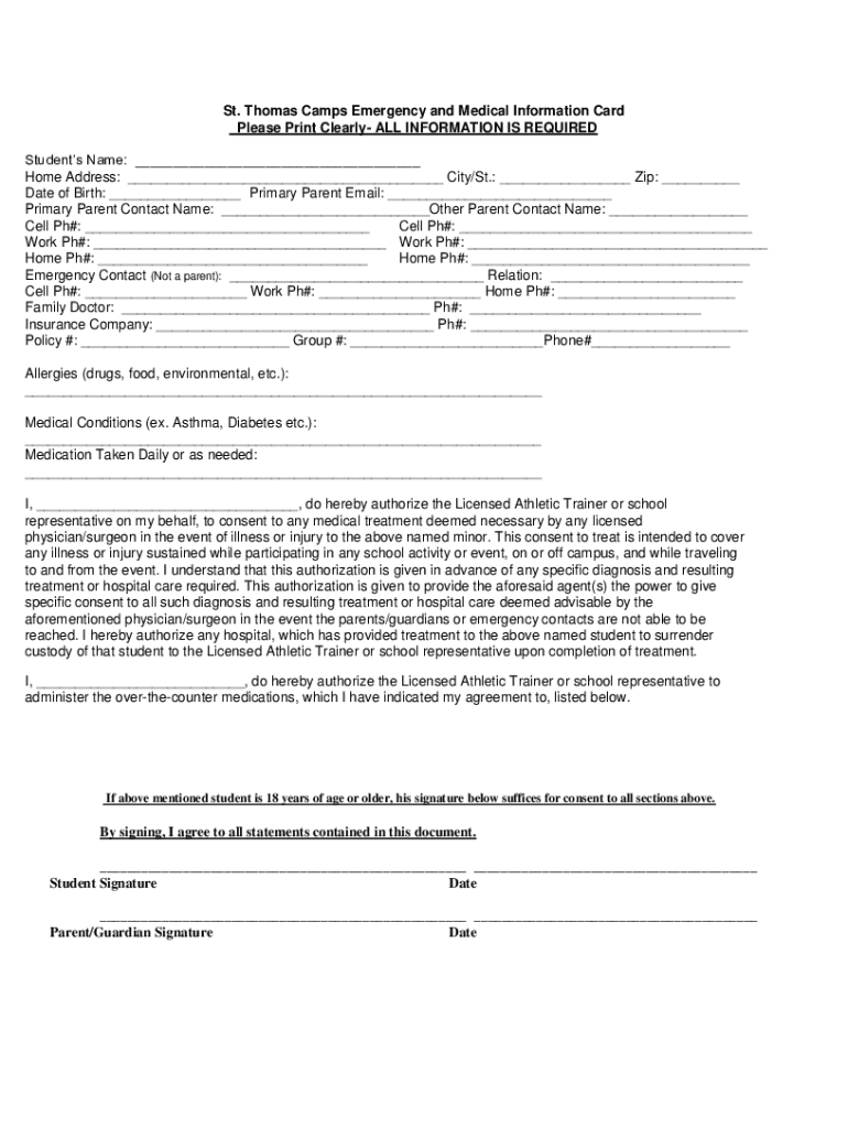Get the free St. Thomas Camps Emergency and Medical Information Card ...