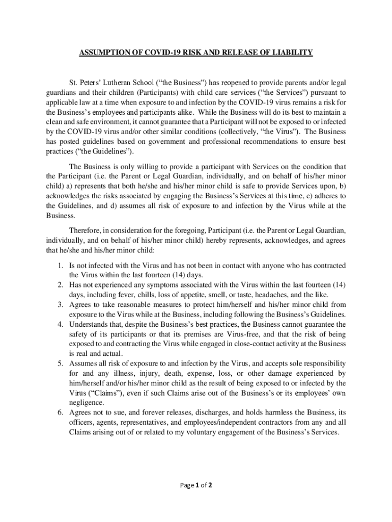ASSUMPTION OF COVID-19 RISK AND RELEASE OF LIABILITY St. Peters Lutheran School (the Business) has reopened to provide parents and/or legal