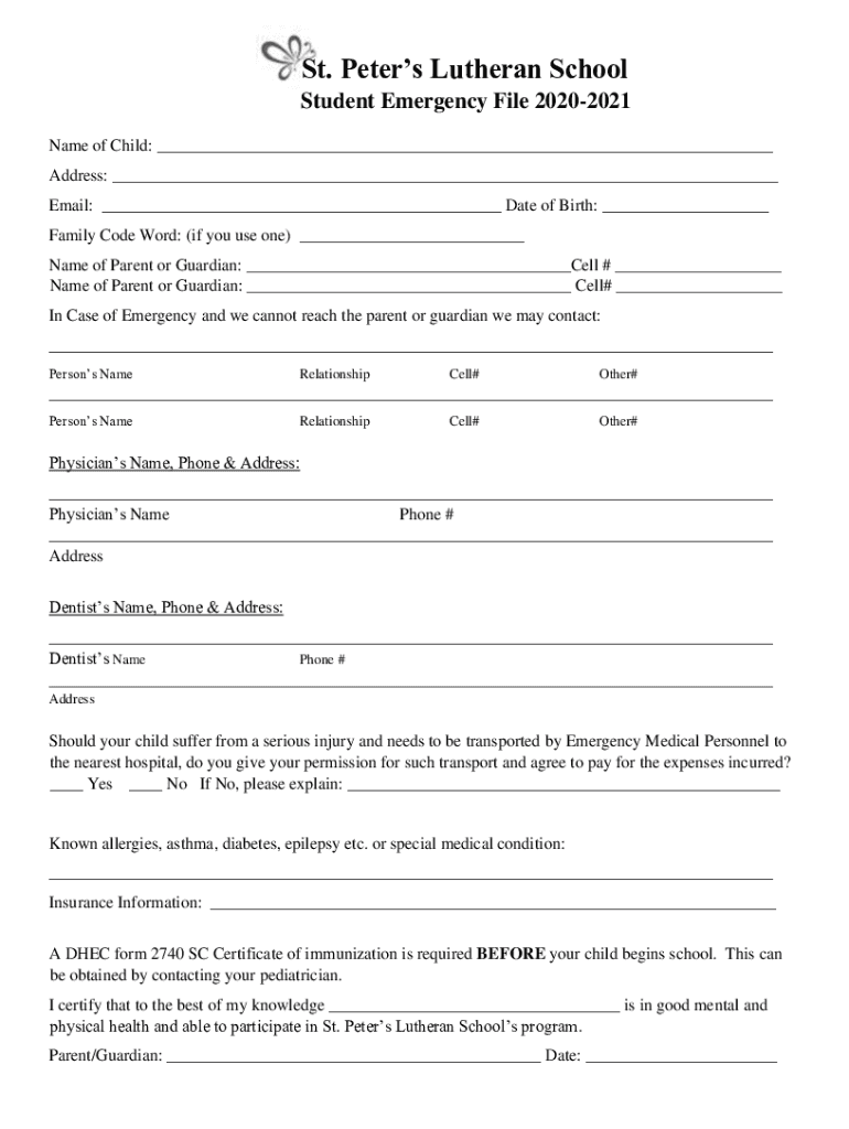 St. Peters Lutheran School Student Emergency File 20202021 Name of Child: Address: Email: Date of Birth: Family Code Word: (if you use one) Name of Parent or Guardian: Cell # Name of Parent or Guardian:
