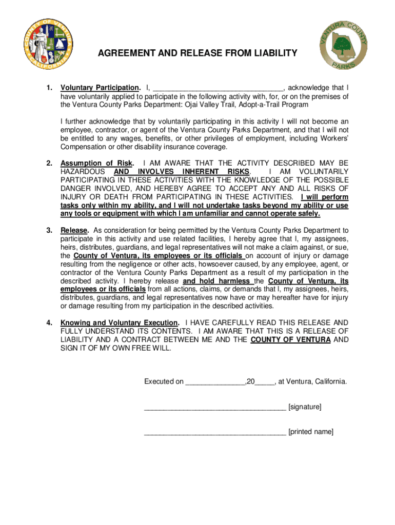 AGREEMENT AND RELEASE FROM LIABILITY1. Voluntary Participation. I, acknowledge that I have voluntarily applied to participate in the following activity with, for, or on the premises of the Ventura
