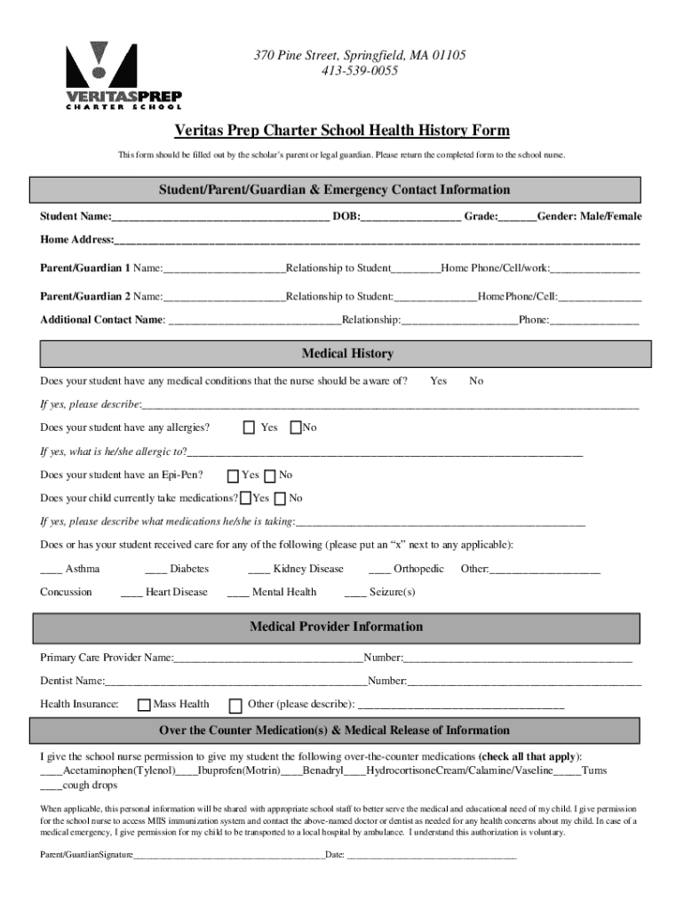 370 Pine Street, Springfield, MA 01105 4135390055Veritas Prep Charter School Health History Form This form should be filled out by the scholars parent or legal guardian. Please return the completed