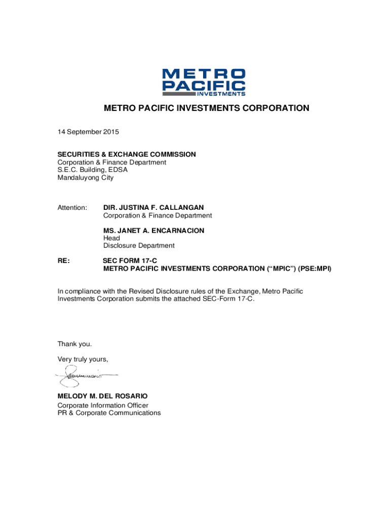 METRO PACIFIC INVESTMENTS CORPORATION 14 September 2015SECURITIES & EXCHANGE COMMISSION Corporation & Finance Department S.E.C. Building, ESA Mandaluyong Inattention:DIR. JUSTINA F. CALLAHAN Corporation