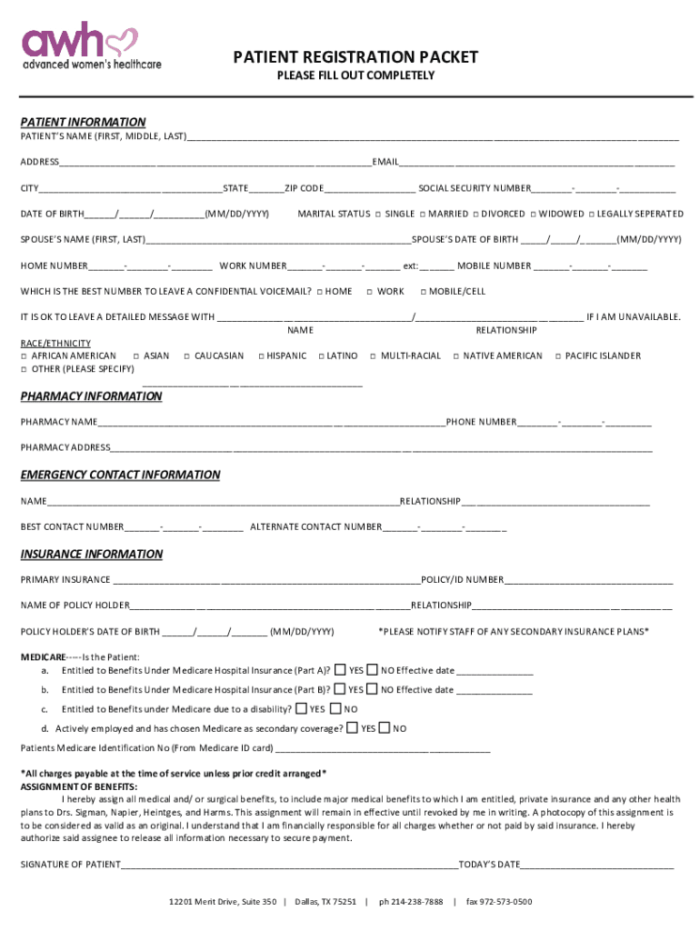 PATIENT REGISTRATION PACKET PLEASE FILL OUT COMPLETELYPATIENT INFORMATION PATIENTS NAME (FIRST, MIDDLE, LAST) ADDRESS EMAIL CITY STATE ZIP CODE SOCIAL SECURITY NUMBER DATE OF BIRTH / / (MM/DD/YYY)MARITAL