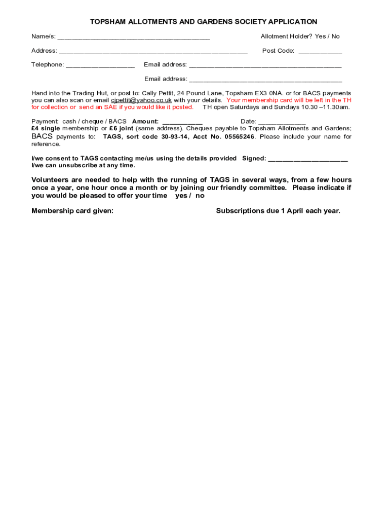 TOPHAM ALLOTMENTS AND GARDENS SOCIETY APPLICATION Name/s: Allotment Holder? Yes / Address: Post Code: Telephone: Email address: Email address: Hand into the Trading Hut, or post to: Call Pet tit,