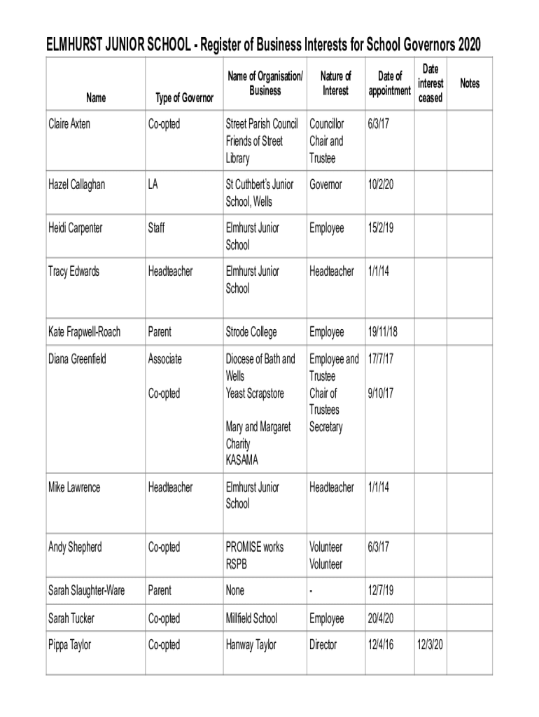 ELMHURST JUNIOR SCHOOL Register of Business Interests for School Governors 2020 Namely of Governorate of Organization/ BusinessNature of Interstate of appointment Claire AxtenCooptedStreet Parish