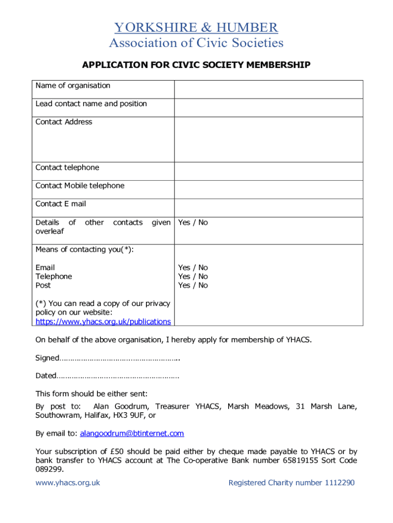YORKSHIRE & HUMBER Association of Civic Societies APPLICATION FOR CIVIC SOCIETY MEMBERSHIP Name of organization Lead contact name and position Contact AddressContact telephone Contact Mobile telephone