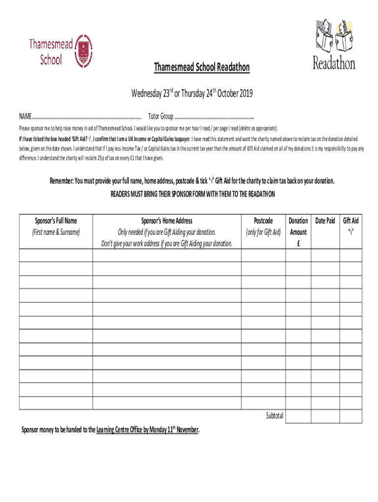 NAME...... Tutor Group .... Please sponsor me to help raise money in aid of Thames mead School. I would like you to sponsor