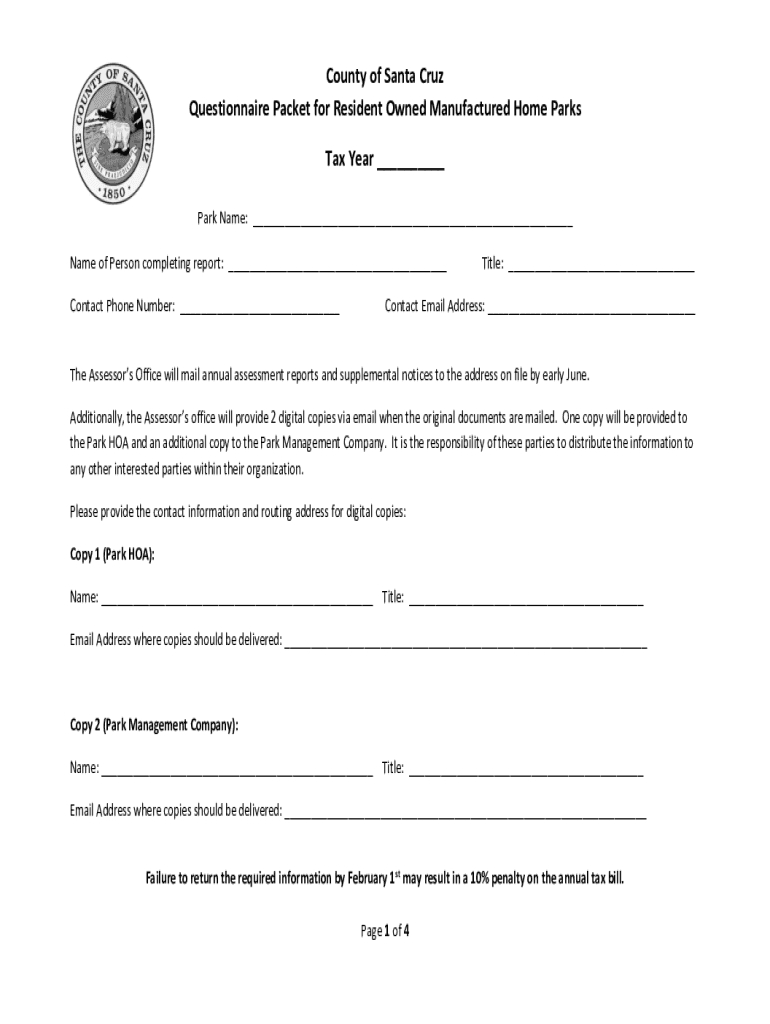 County of Santa Cruz Questionnaire Packet for Resident Owned Manufactured Home Parks Tax Year Park Name: Name of Person completing report: Contact Phone Number: Title: Contact Email Address: The Assessors