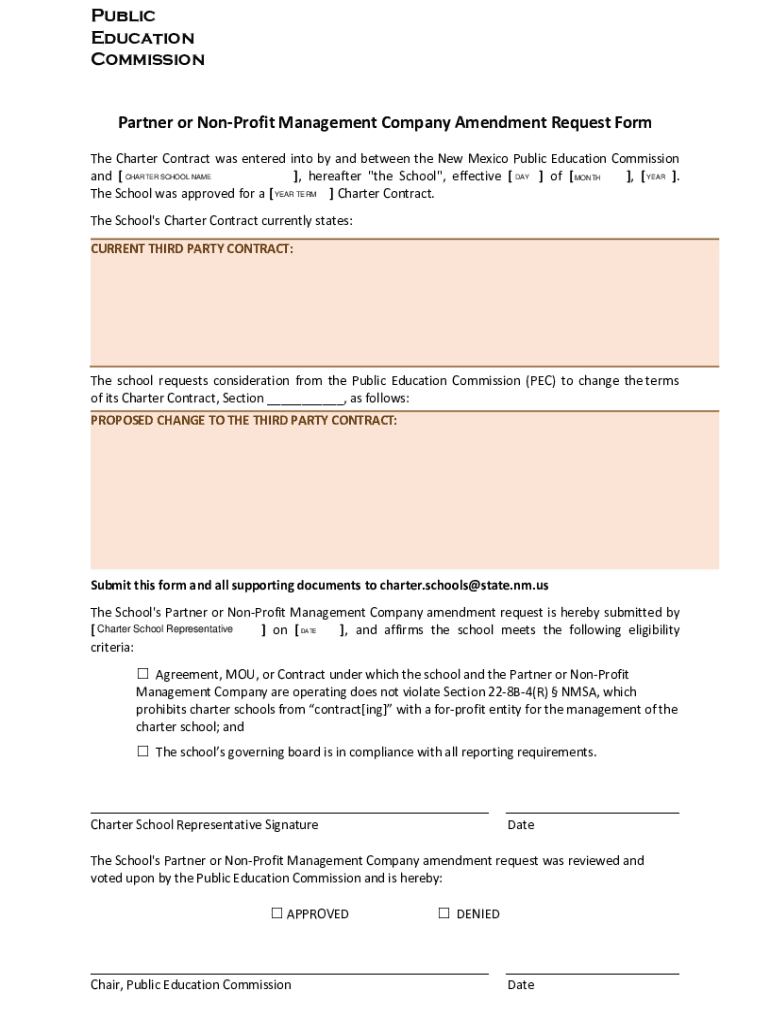Public Education CommissionPartner or Nonprofit Management Company Amendment Request Form The Charter Contract was entered into by and between the New Mexico Public Education Commission and CHARTER