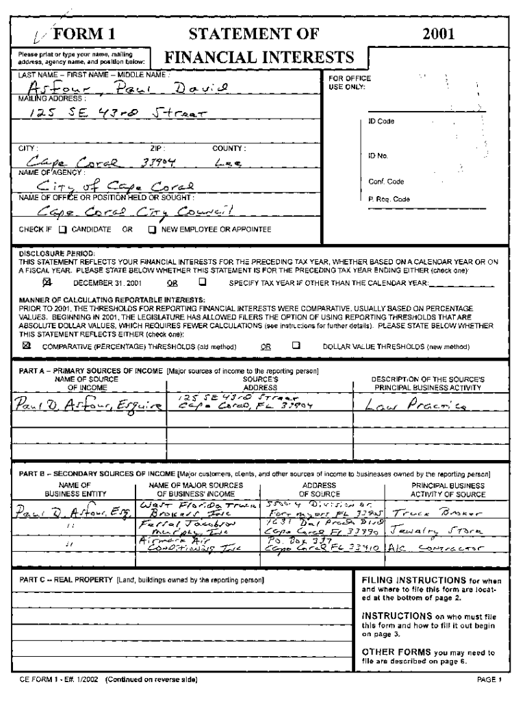 FORM 1 STATEMENT OF 2001 Please print or type your name, many addresses, agency name, and position below:FINANCIAL INTERESTSLAST NAME FIRST NAME MIDDLE NAME :FOR OFFICE USE ONLY:o., RQ c. ! V 'z DL