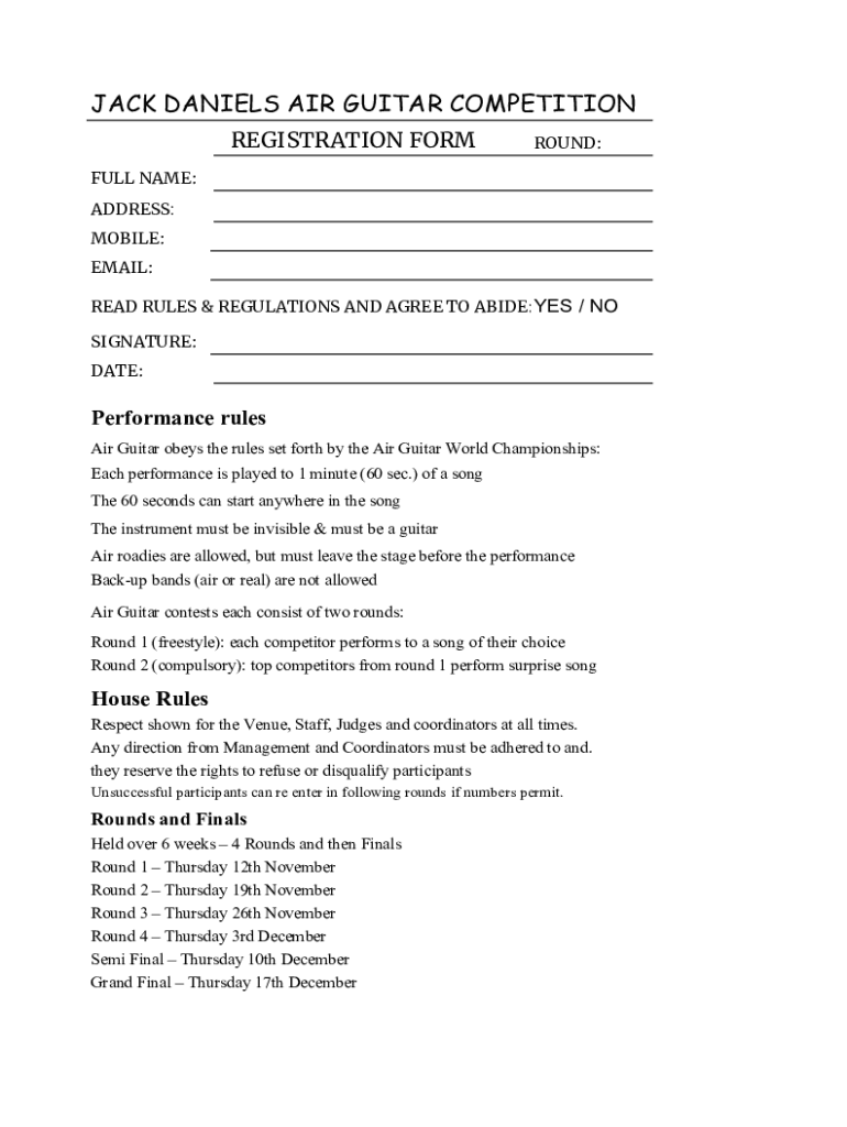Jack Daniel's AIR GUITAR COMPETITION REGISTRATION FOREGROUND:FULL NAME: ADDRESS: MOBILE: EMAIL: READ RULES & REGULATIONS AND AGREE TO ABIDE: YES / NO SIGNATURE: DATE:Performance rules Air Guitar obeys