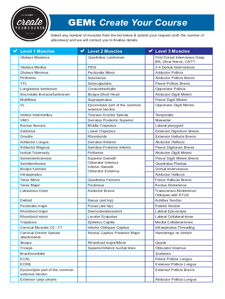 Get Create Your Course Select any number of muscles from the list below & submit your request (with the number of attendees) and we will contact you to finalize details. Level 1 Muscles Gluteus Maximus