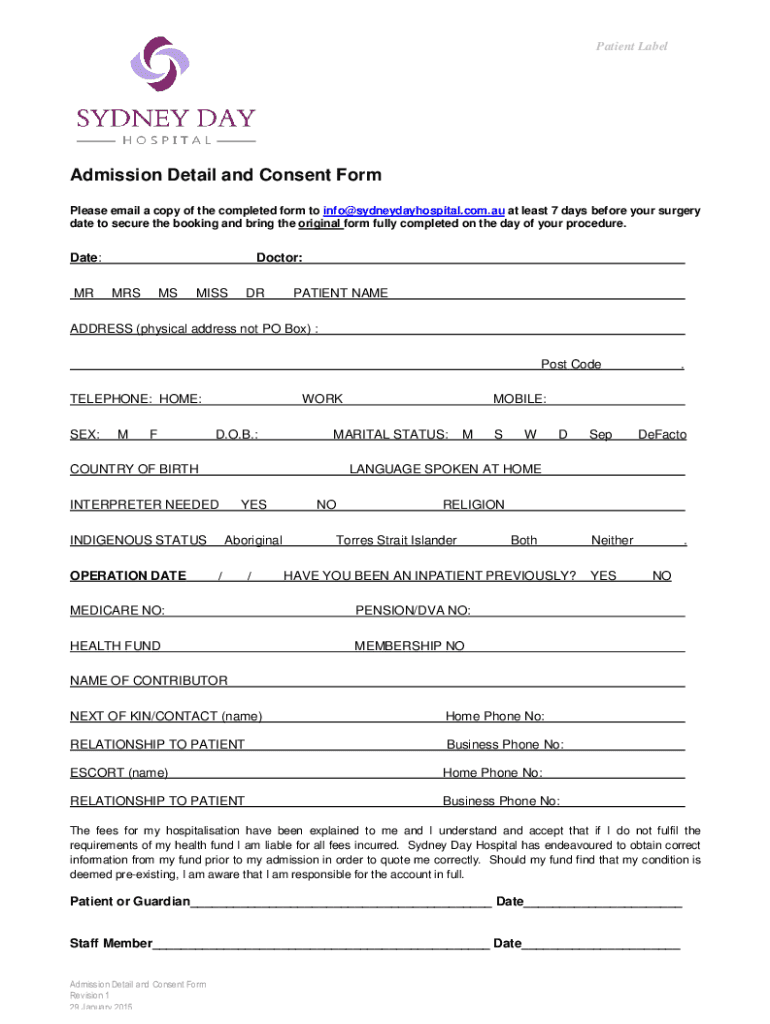 Get the free Admission Detail and Consent Form - Sydney Day Hospital