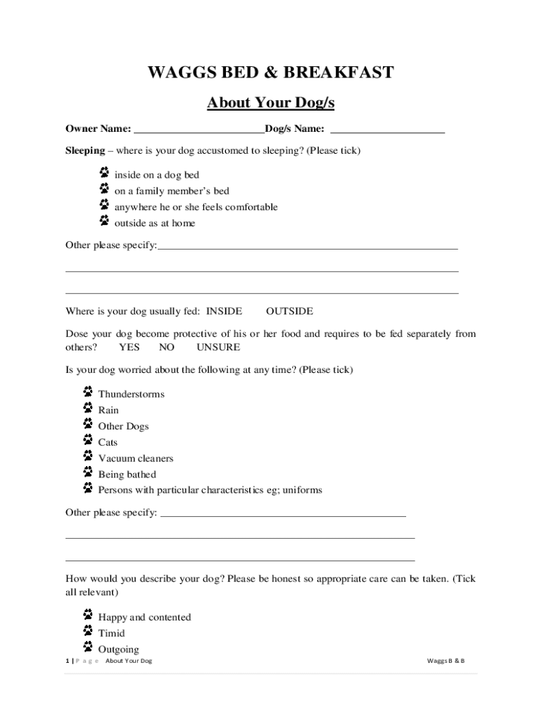 WAGES BED & BREAKFAST About Your Dog/s Owner Name: Dog/s Name: Sleeping where is your dog accustomed to sleeping? (Please tick) inside on a dog bed on a family members bed anywhere he or she feels