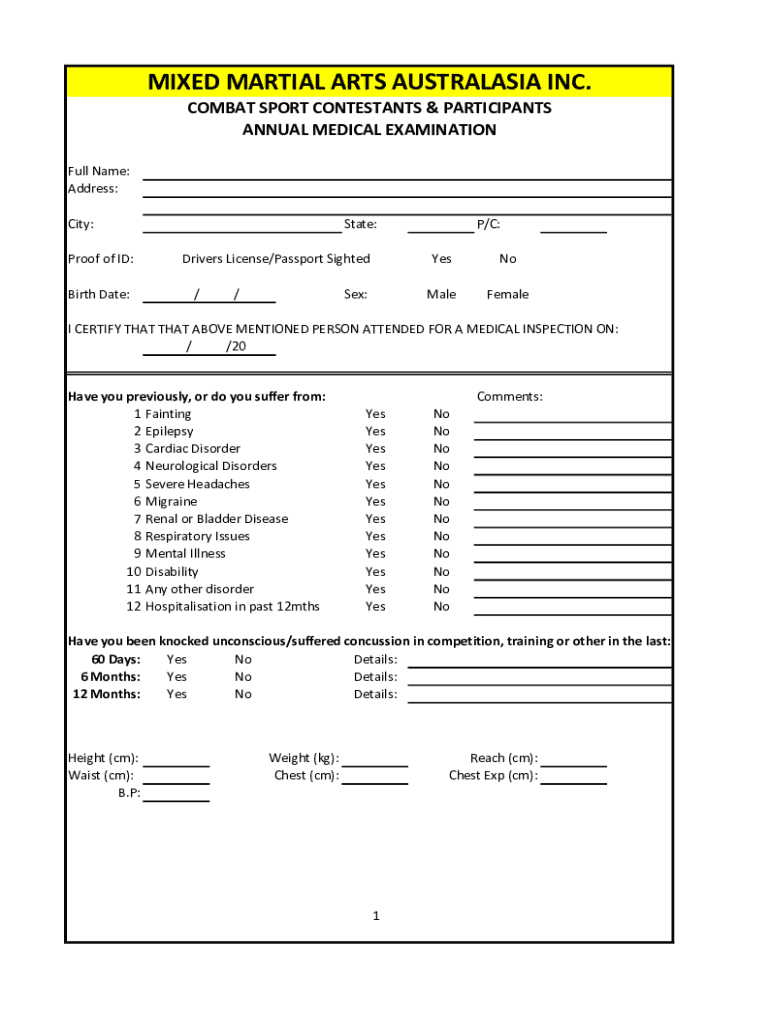 MIXED MARTIAL ARTS AUSTRALASIA INC. COMBAT SPORT CONTESTANTS & PARTICIPANTS ANNUAL MEDICAL EXAMINATION Full Name: Address: City: Proof of ID: Birth Date:State: Driver's License/Passport Sighted //Sex:P/C: