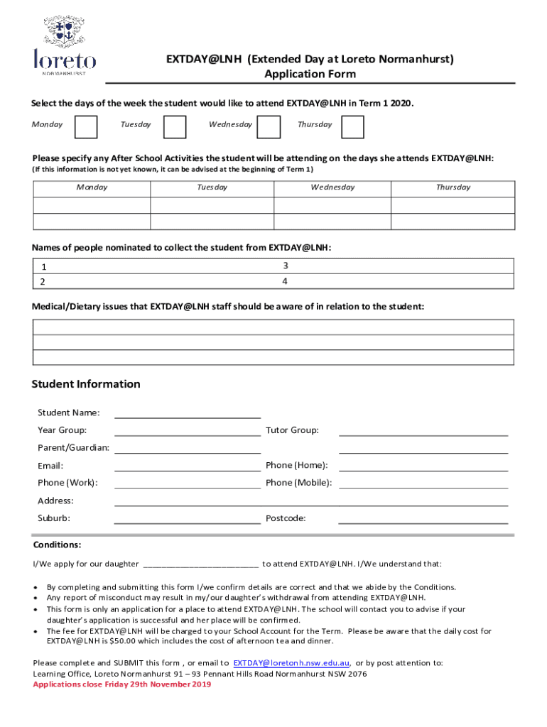 Get the free EXTDAYLNH (Extended Day at Loreto Normanhurst Application ...