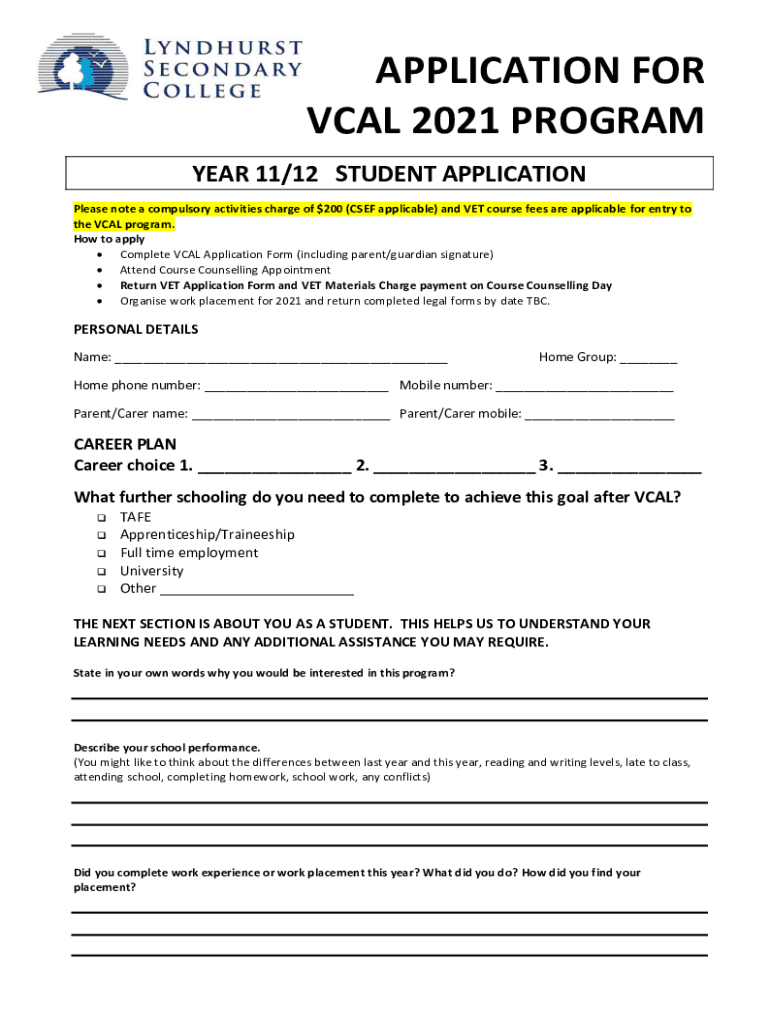 APPLICATION FOR VOCAL 2021 PROGRAM YEAR 11/12 STUDENT APPLICATION Please note a compulsory activities charge of $200 (CHEF applicable) and VET course fees are applicable for entry to the VOCAL program.