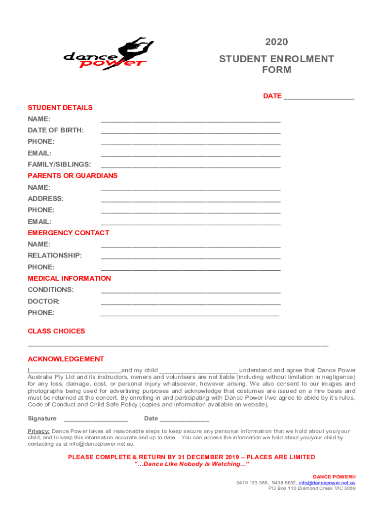 2020 STUDENT Enrollment FORM DATE STUDENT DETAILS NAME: DATE OF BIRTH: PHONE: EMAIL: FAMILY/SIBLINGS: PARENTS OR GUARDIANS NAME: ADDRESS: PHONE: EMAIL: EMERGENCY CONTACT NAME: RELATIONSHIP: PHONE: