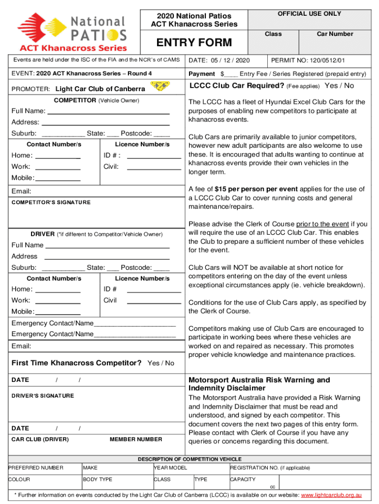 OFFICIAL USE ONLY2020 National Patios ACT Khan across SeriesClassCar NumberENTRY FORM Events are held under the ISC of the FIA and the NCR of CAUDATE: 05 / 12 / 2020EVENT: 2020 ACT Khan across Series