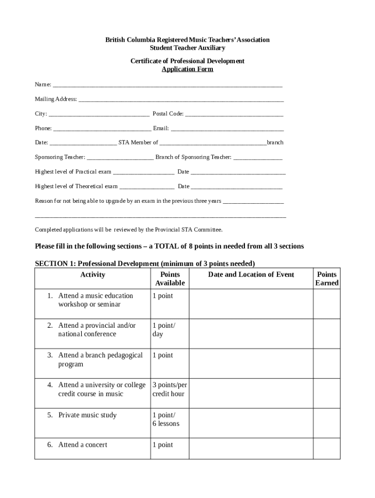 British Columbia Registered Music Teachers Association Student Teacher Auxiliary Certificate of Professional Development Application Form Name: Mailing Address: City: Postal Code: Phone: Email: Date: