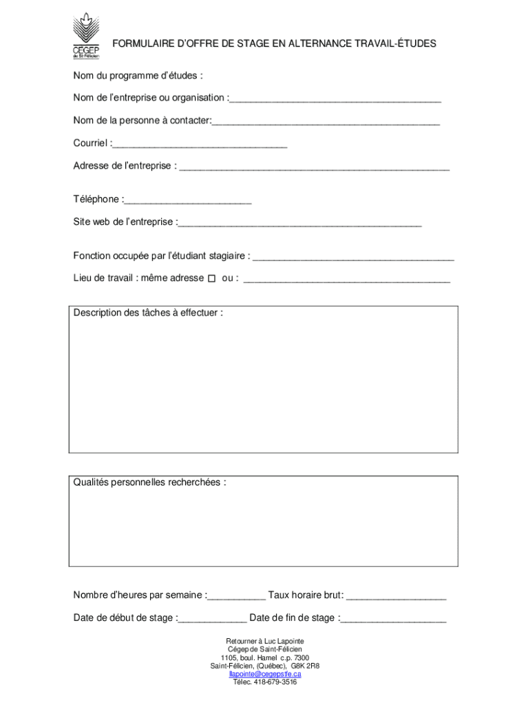 FORMULA IRE DOFF RE DE STAGE EN ALTERNANCE TRAVAILTUDES Not Du program études : Not DE lent reprise of organization : Not DE la personnel contacted: Courier : Address DE lent reprise : Tl phone :