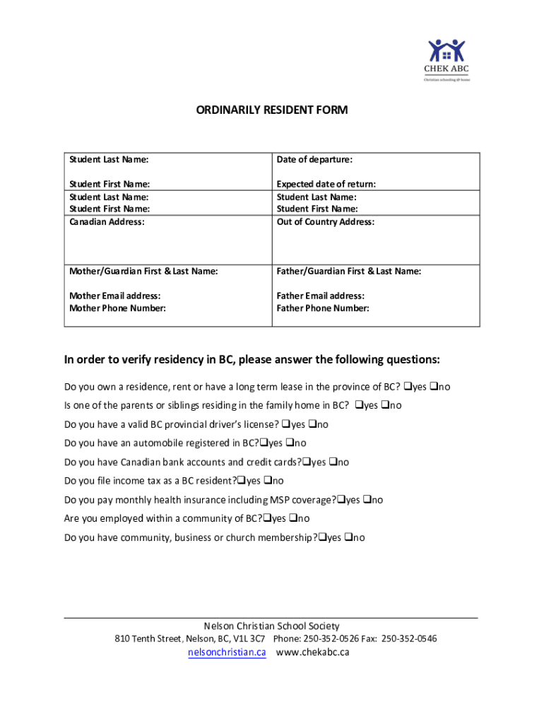 ORDINARILY RESIDENT FORMStudent Last Name:Date of departure:Student First Name: Student Last Name: Student First Name: Canadian Address:Expected date of return: Student Last Name: Student First Name: