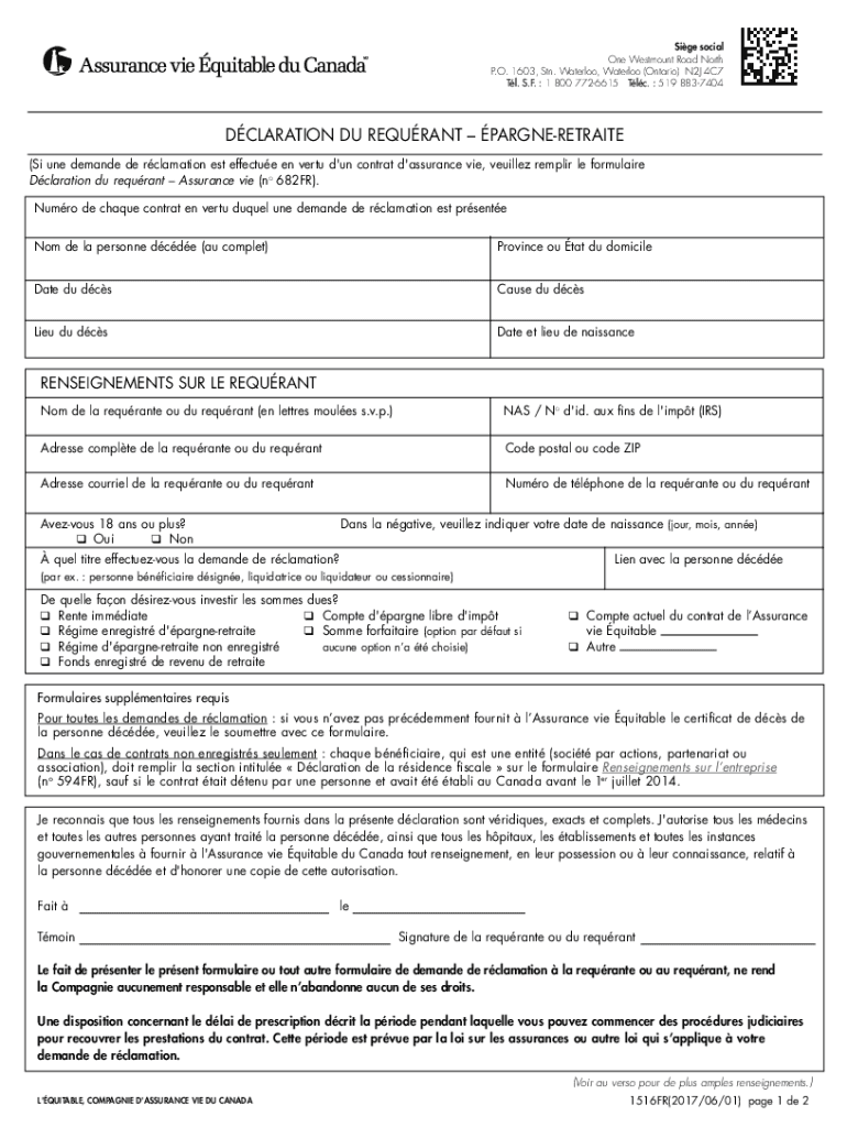 Side social One West mount Road North P.O. 1603, STN. Waterloo, Waterloo (Ontario) N2J 4C7 Tl. S.F. : 18007726615 TLC. 5198837404DCLARATION DU RETURN PARGNERETRAITE (Si one demand DE reclamation