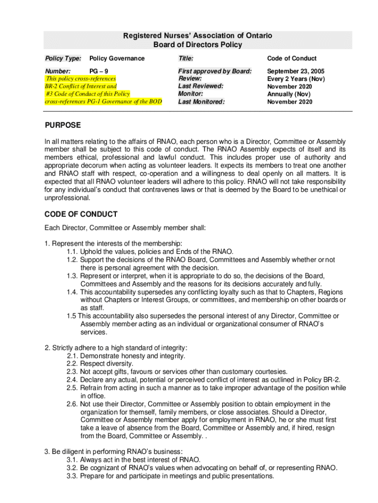 Registered Nurses Association of Ontario Board of Directors Policy Type:Policy GovernanceNumber: PG 9 This policy cross-references BR2 Conflict of Interest and #3 Code of Conduct of this Policy cross-references