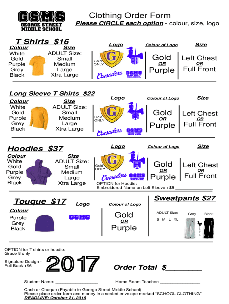 Clothing Order Form Please CIRCLE each option color, size, logo Shirts $16 Color White Gold Purple Grey Backside ADULT Size: Small Medium Large Extra LargeLogoGold Online ADULT Size: Small Medium