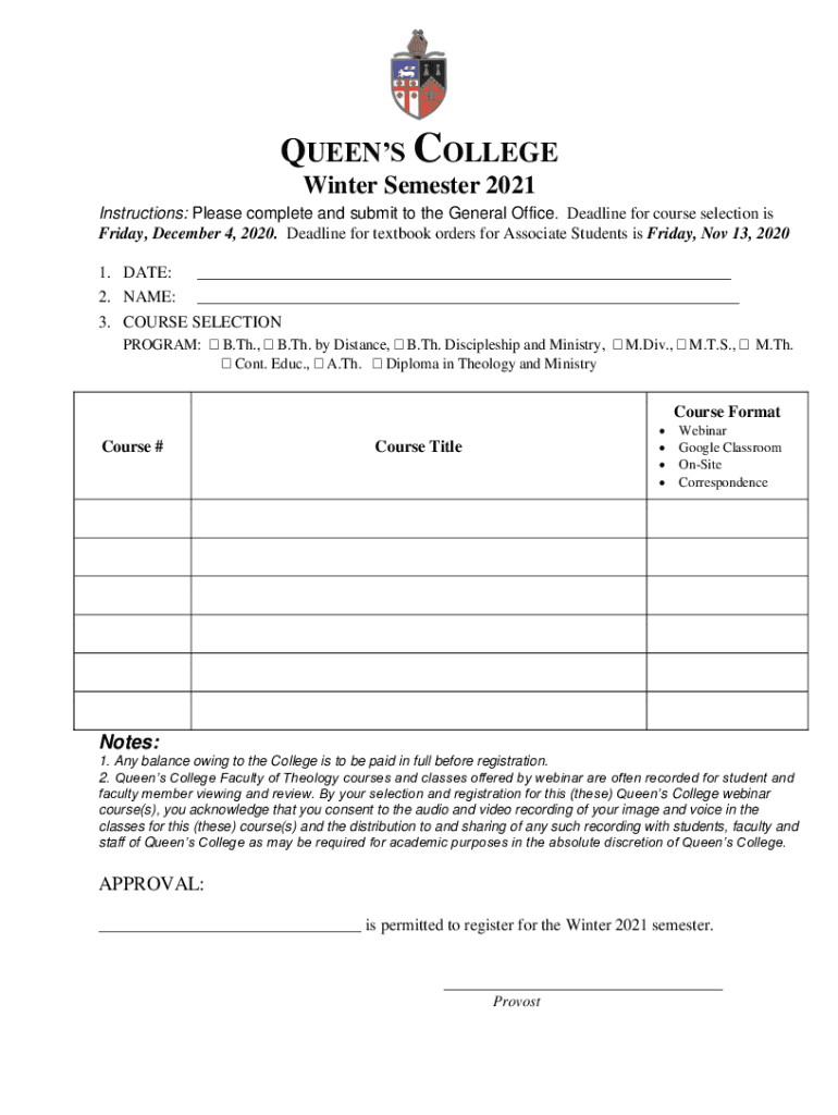 QUEENS COLLEGE Winter Semester 2021 Instructions: Please complete and submit to the General Office. Deadline for course selection is Friday, December 4, 2020. Deadline for textbook orders for Associate