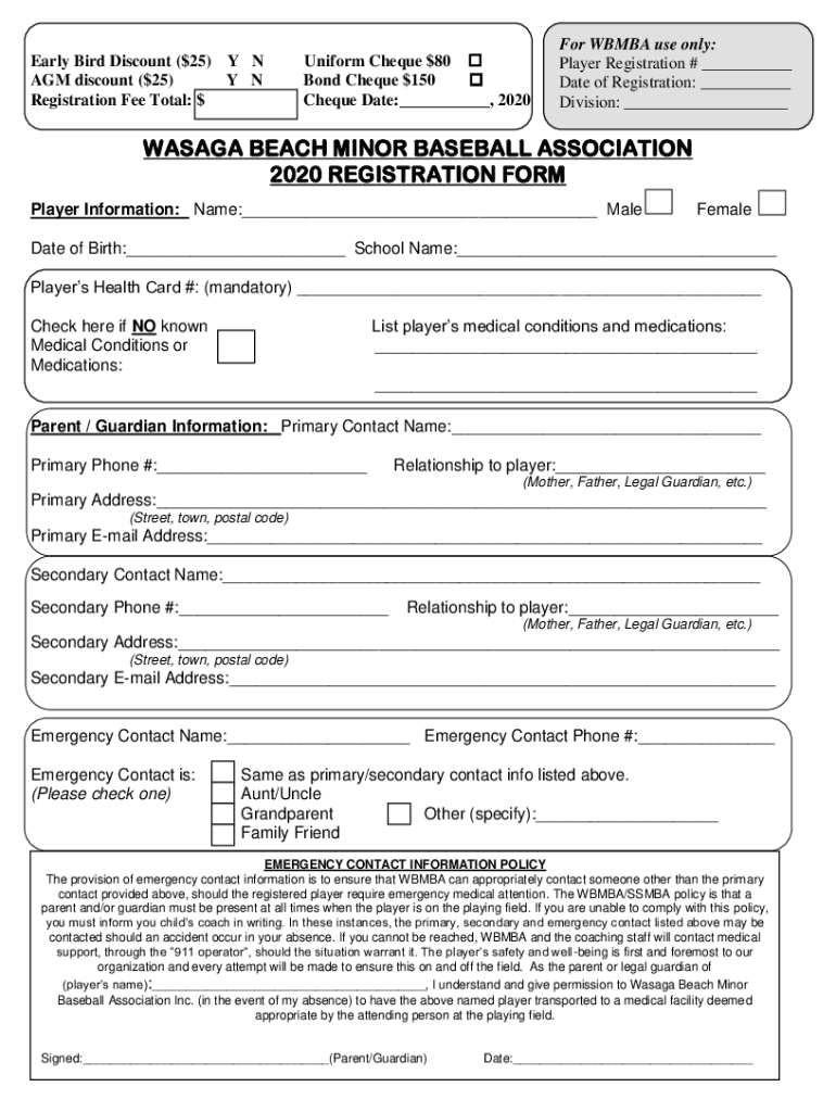 Get the free WASAGA BEACH MINOR BASEBALL ASSOCIATION 2020 REGISTRATION FORM