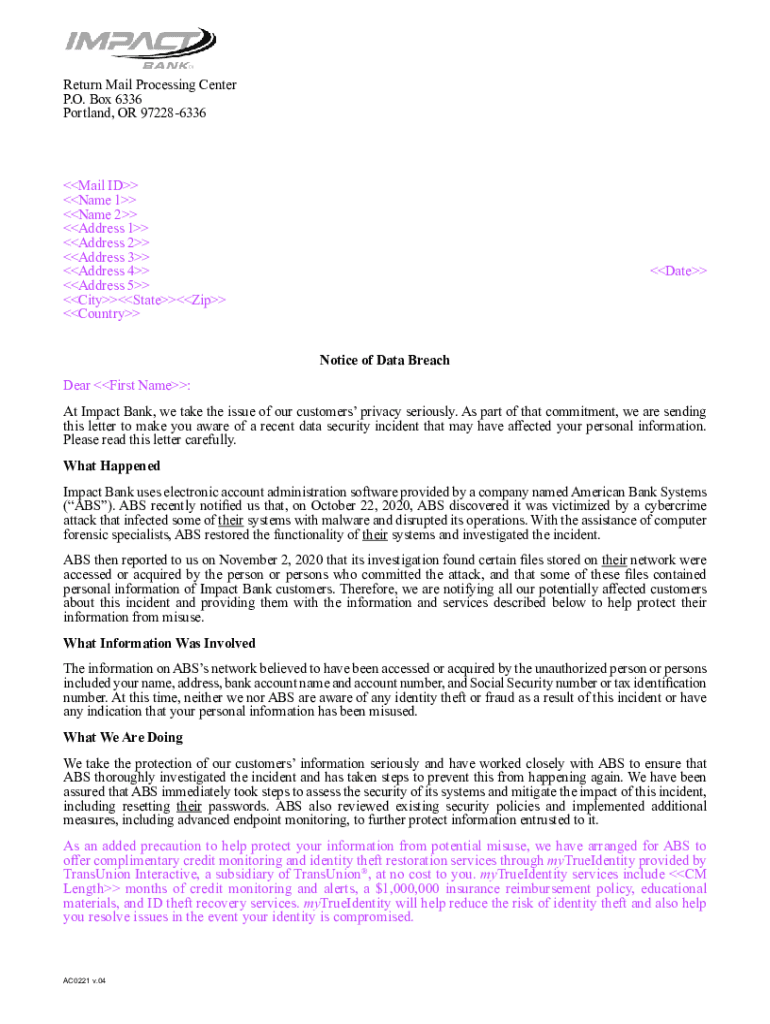 Get the free Notice of Data Breach Dear : At Impact Bank, we ...