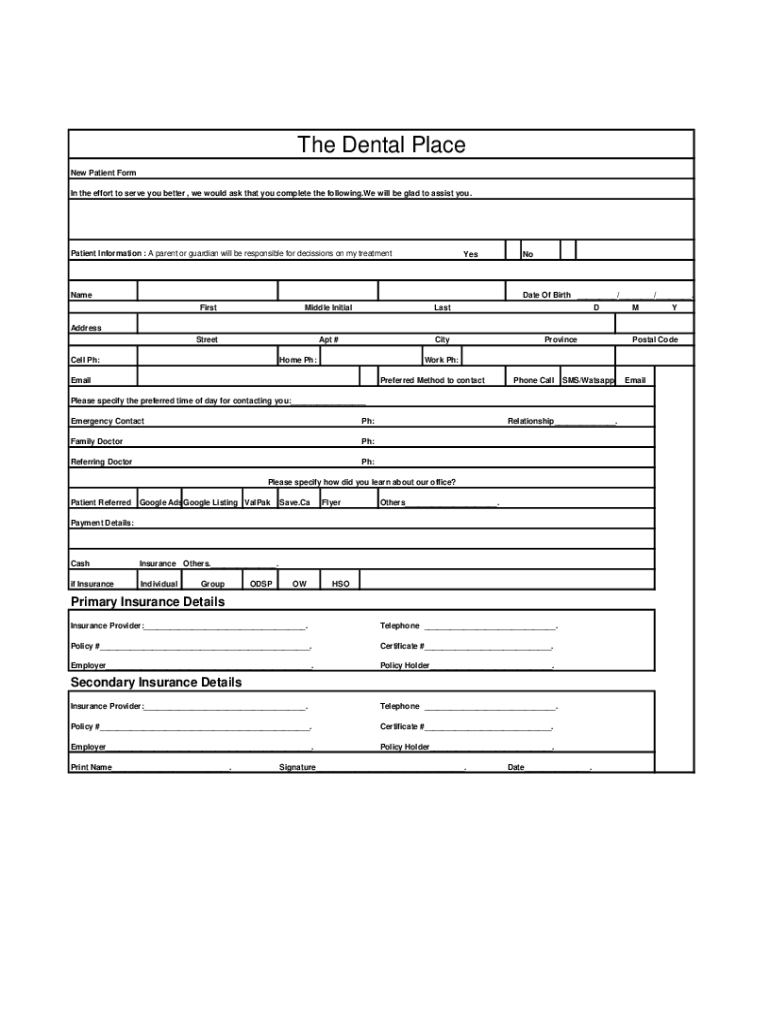 The Dental Place New Patient Form In the effort to serve you better, we would ask that you complete the following. We will be glad to assist you. Patient Information : A parent or guardian will be