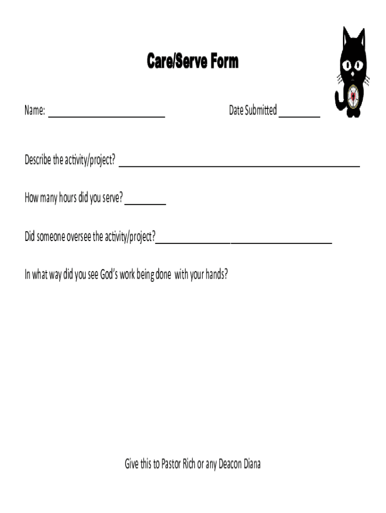 Care/Serve Form Name: Date Submitted Describe the activity/project? How many hours did you serve? Did someone oversee the activity/project? In what way did you see Gods work being done with your hands?