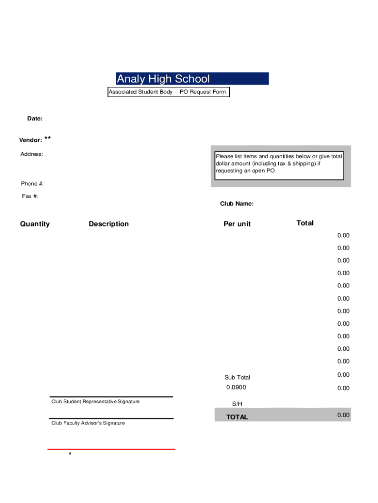 Anal High School Associated Student Body PO Request Form Anal High School ASB Person requesting PO:Date:Vendor:**Address:Please list items and quantities below or give total dollar amount (including
