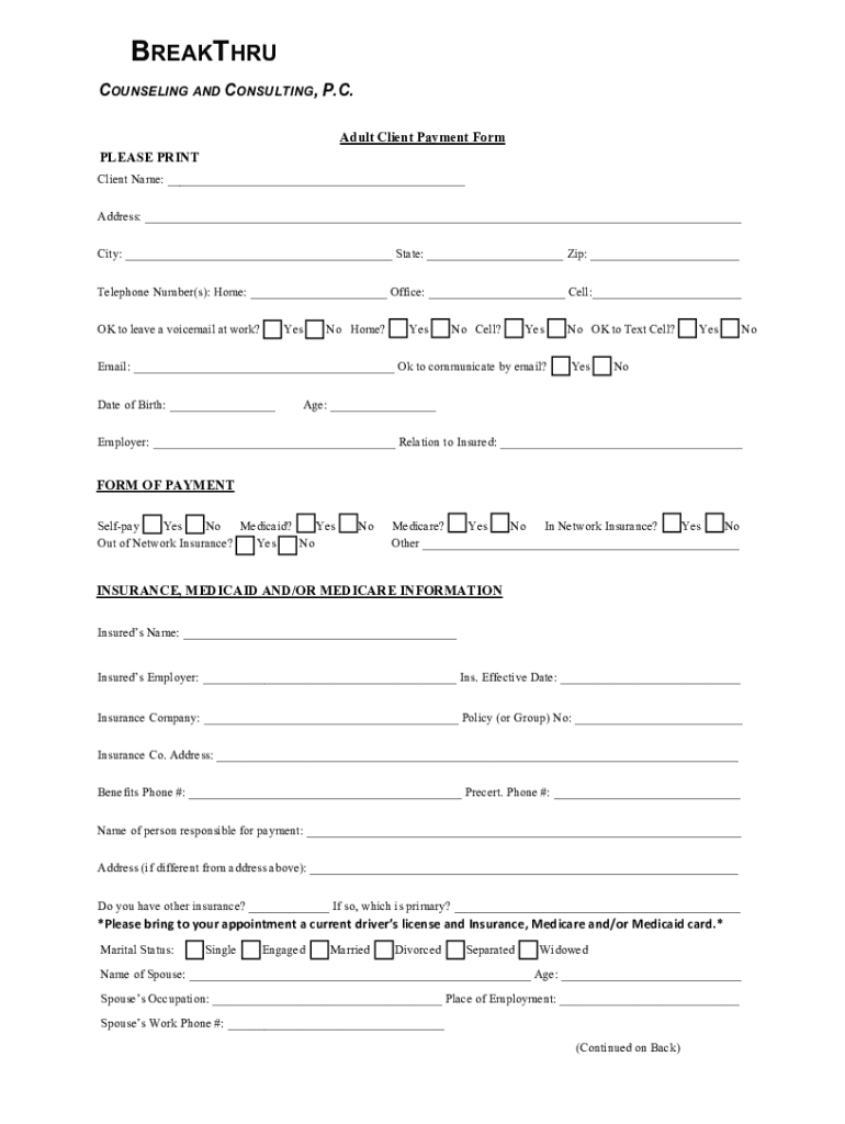 BREAKTHROUGH COUNSELING AND CONSULTING, P.C. Adult Client Payment Form PLEASE PRINT Client Name: Address: City: State: Zip: Telephone Number(s): Home: Office: Cell: OK to leave a voicemail at work?