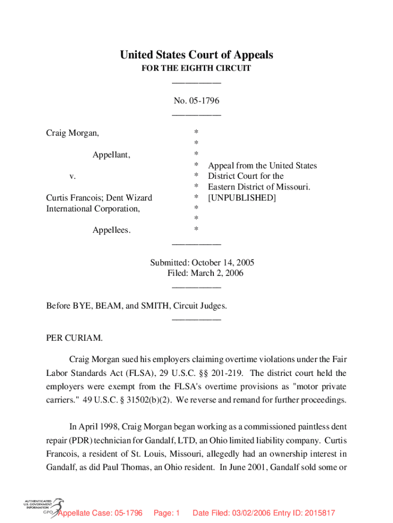 United States Court of Appeals FOR THE EIGHTH CIRCUIT No. 051796 Craig Morgan, Appellant, v. Curtis Francois; Dent Wizard International Corporation, Expellees.* * * * Appeal from the United States