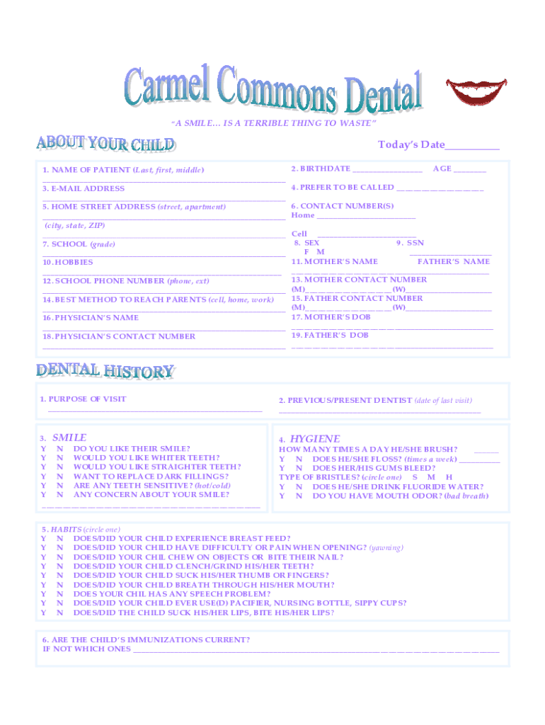 SMILE IS A TERRIBLE THING TO WASTETodays Date 1. NAME OF PATIENT (Last, first, middle) 3. EMAIL ADDRESS 5. HOME STREET ADDRESS (street, apartment) (city, state, ZIP) 7. SCHOOL (grade) 10. HOBBIES